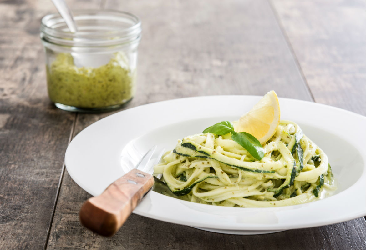 Ni la falta de ideas ni de tiempo son ya excusas para no cocinar en casa. La alimentación saludable es fundamental y se puede llevar a cabo sin tener demasiados conocimientos gracias a la ayuda de recetas que vienen dadas como estos espaguetis de calabacín al pesto.